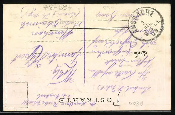 Personenbezogene Daten auf der Rückseite der Karte wurden durch blauen Textmarker unkenntlich gemacht. Die blauen Stellen sind auf die Vorderseite durchgeweicht und wirken sich negativ auf das Postkartenfoto aus