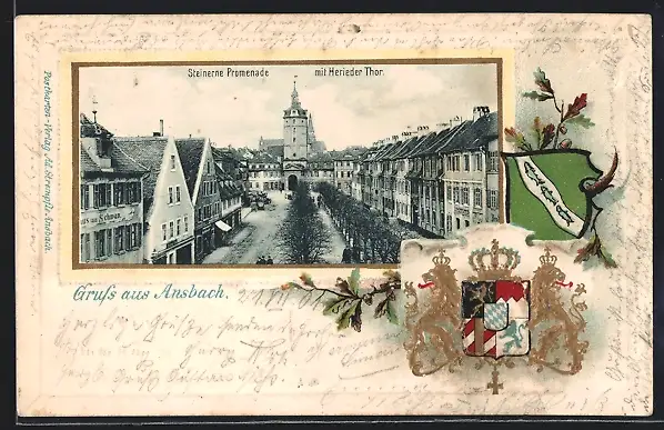 Passepartout-Lithographie Ansbach, Strasse Steinerne Promenade mit Herieder Tor, Wappen