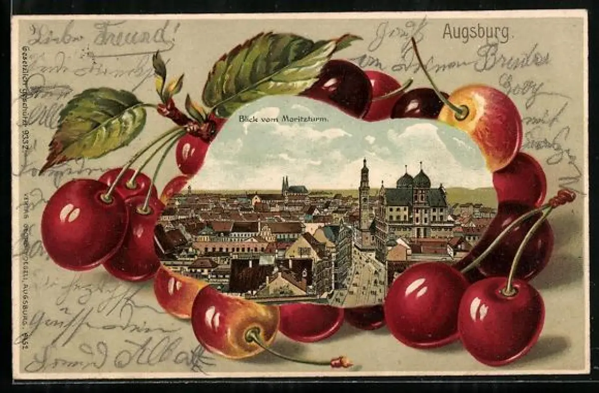 Passepartout-Lithographie Augsburg, Blick vom Moritzturm im Passepartout aus Kirschen