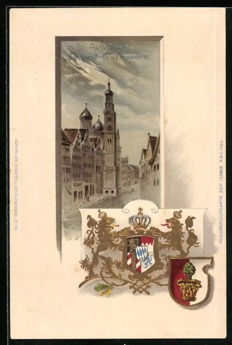 Passepartout-Lithographie Augsburg, Carolinenstrasse und Perlachturm, Wappen