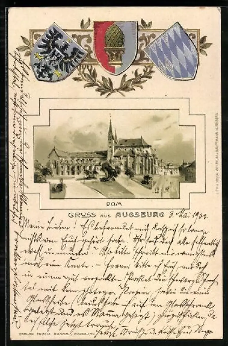 Passepartout-Lithographie Augsburg, Der Dom, Stadt- und Reichswappen