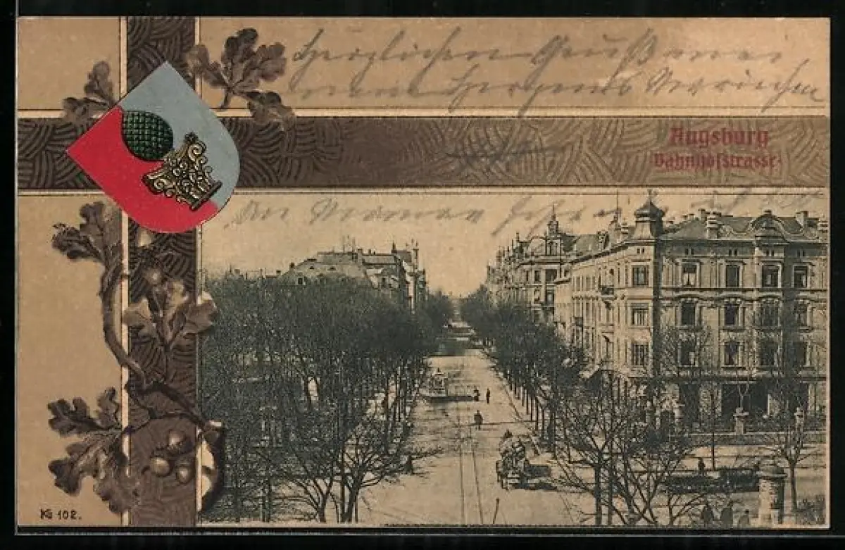 Passepartout-Lithographie Augsburg, Partie an der Bahnhofstrasse mit Stadtwappen im Passepartout