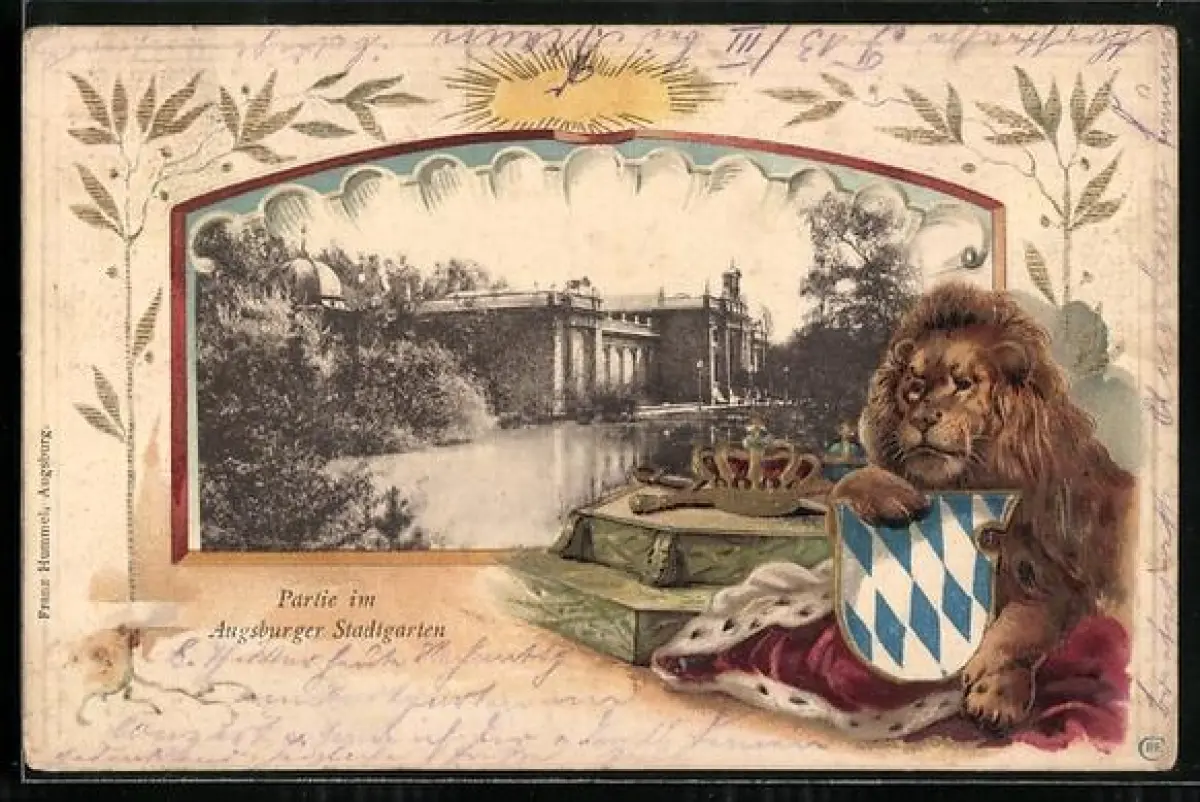 Passepartout-Lithographie Augsburg, Partie im Augsburger Stadtgarten, Löwe mit Wappen