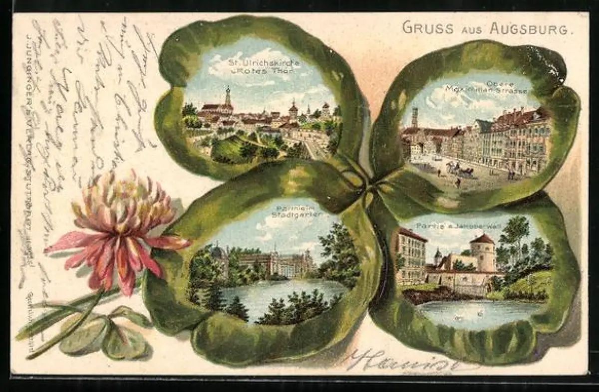Passepartout-Lithographie Augsburg, St. Ulrichskirche & Rotes Thor, Obere Maximilianstrasse, Parthie im Stadtgarten