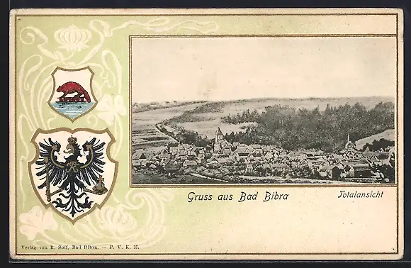 Passepartout-Lithographie Bad Bibra, Totalansicht mit Kirche, Wappen
