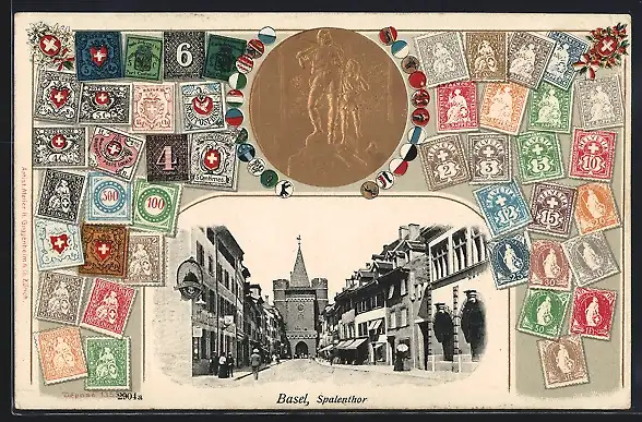 Passepartout-Lithographie Basel, Spalenthor, Briefmarken, Münze mit Denkmal