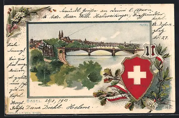 Passepartout-Lithographie Basel, Totalansicht, Schweizer Wappen