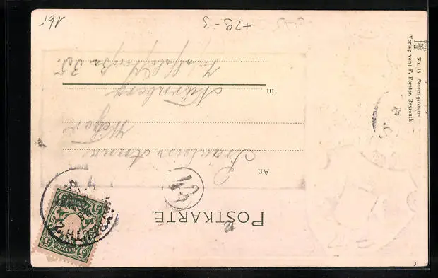 Personenbezogene Daten auf der Rückseite der Karte wurden durch blauen Textmarker unkenntlich gemacht. Die blauen Stellen sind auf die Vorderseite durchgeweicht und wirken sich negativ auf das Postkartenfoto aus