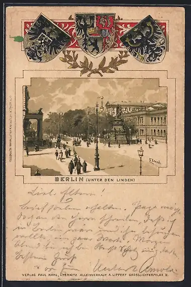 Passepartout-Lithographie Berlin, Unter den Linden, Wappen