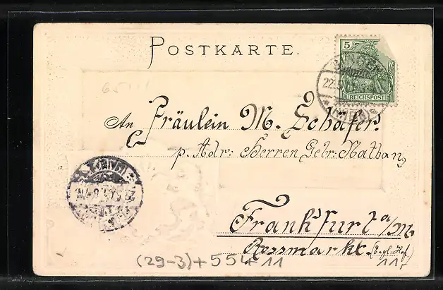 Personenbezogene Daten auf der Rückseite der Karte wurden durch blauen Textmarker unkenntlich gemacht. Die blauen Stellen sind auf die Vorderseite durchgeweicht und wirken sich negativ auf das Postkartenfoto aus