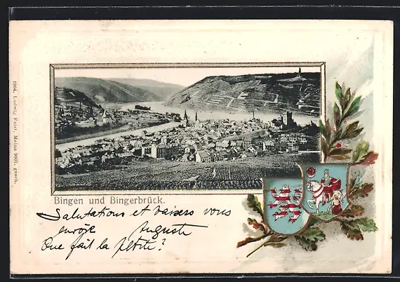 Passepartout-Lithographie Bingen, Stadtansicht mit Bingerbrück, Wappen