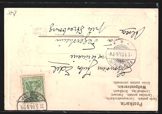 Personenbezogene Daten auf der Rückseite der Karte wurden durch blauen Textmarker unkenntlich gemacht. Die blauen Stellen sind auf die Vorderseite durchgeweicht und wirken sich negativ auf das Postkartenfoto aus