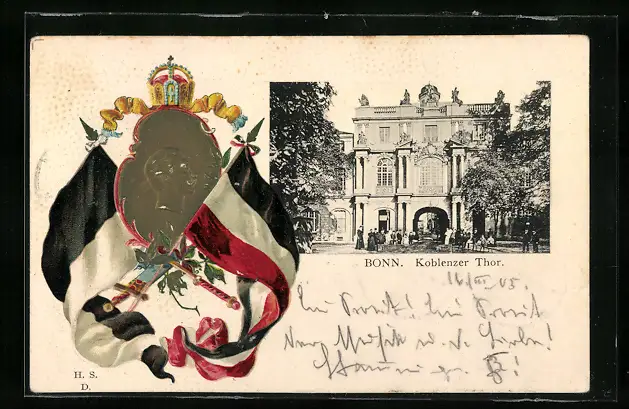 Passepartout-Lithographie Bonn, Koblenzer Tor, Wappen mit Kaiser Wilhelm II., Fahnen