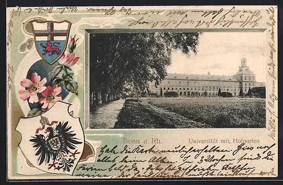 Passepartout-Lithographie Bonn a. Rh., Universität mit Hofgarten, Wappen