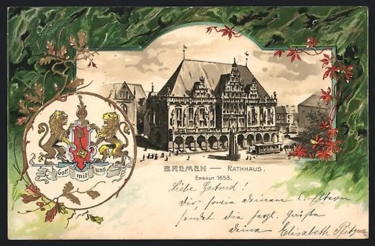 Passepartout-Lithographie Bremen, Blick zum Rathaus, erbaut 1553, Wappen