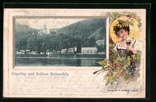 Passepartout-Lithographie Capellen, Teilansicht mit Schloss Stolzenfels, Frau in Tracht mit Weinglas