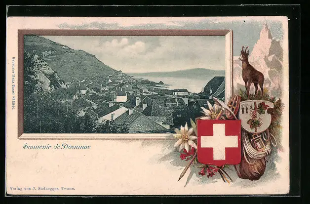 Passepartout-Lithographie Douanne, Ortsansicht aus der Vogelschau