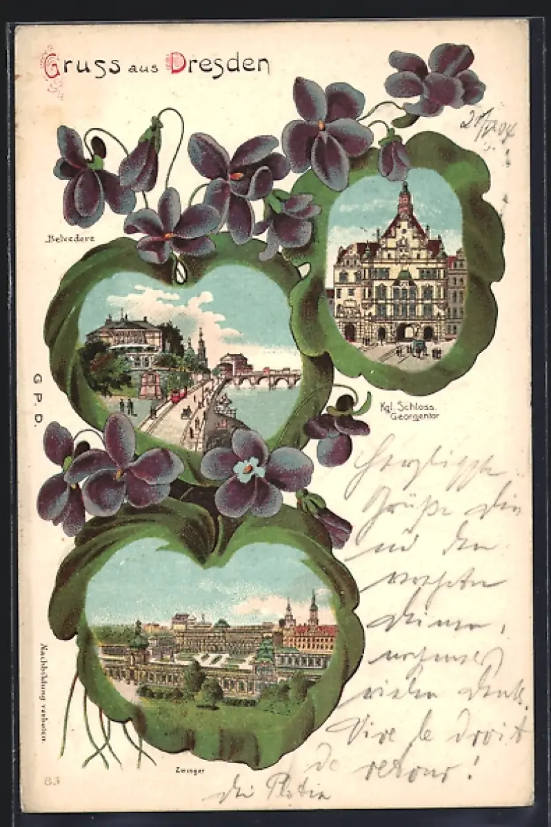 Passepartout-Lithographie Dresden, Kgl. Schloss, Georgenthor, Belvedere, Zwinger, Eichenblatt