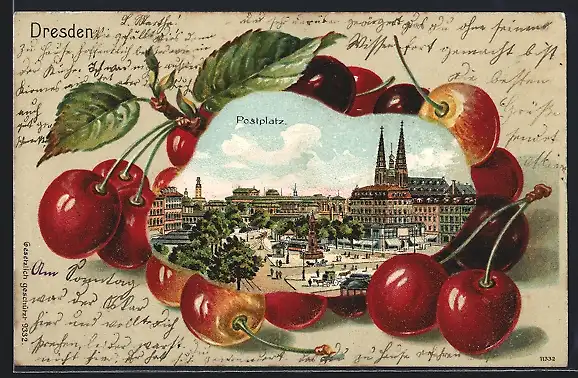 Passepartout-Lithographie Dresden, Postplatz, Kirschen