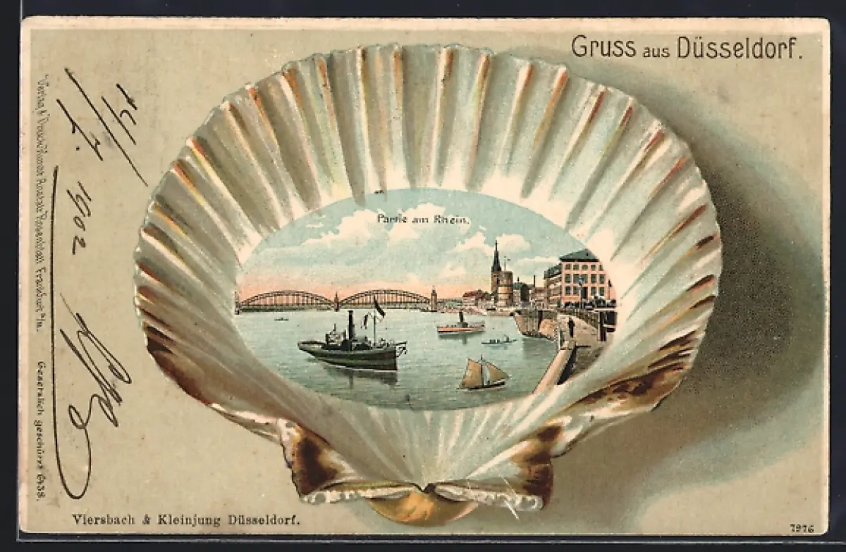 Passepartout-Lithographie Düsseldorf, Partie am Rhein in einer Muschel