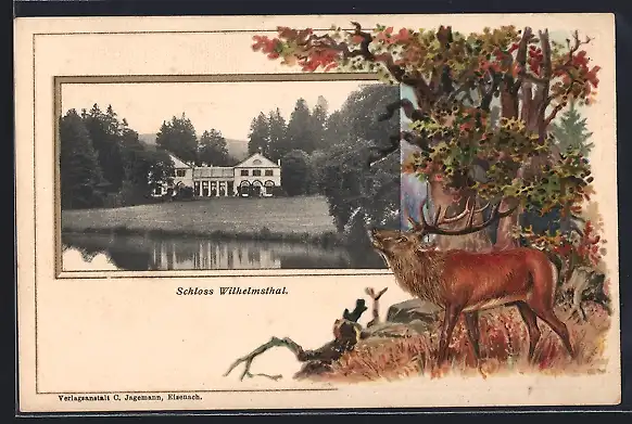 Passepartout-Lithographie Eisenach, Schloss Wilhelmsthal, röhrender Hirsch