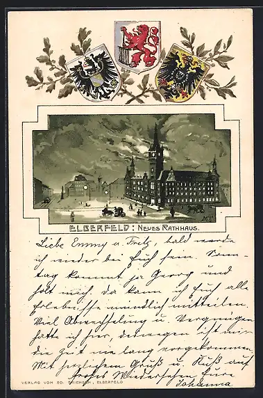 Passepartout-Lithographie Elberfeld, Neues Rathaus, Wappen und Eichenzweig