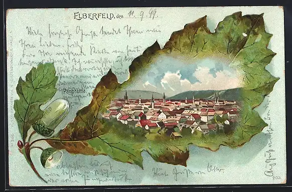 Passepartout-Lithographie Elberfeld, Stadtpanorama, Eichenblatt