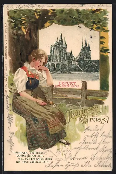 Passepartout-Lithographie Erfurt /Thüringen, Dom und Severikirche, Frau in Tracht