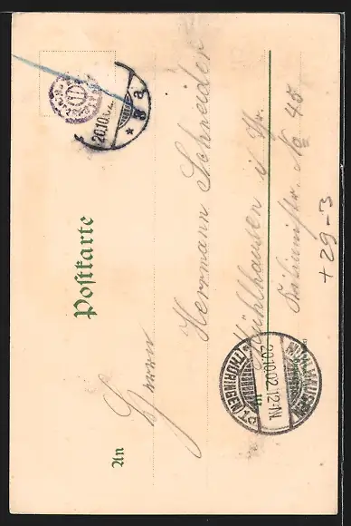 Personenbezogene Daten auf der Rückseite der Karte wurden durch blauen Textmarker unkenntlich gemacht. Die blauen Stellen sind auf die Vorderseite durchgeweicht und wirken sich negativ auf das Postkartenfoto aus