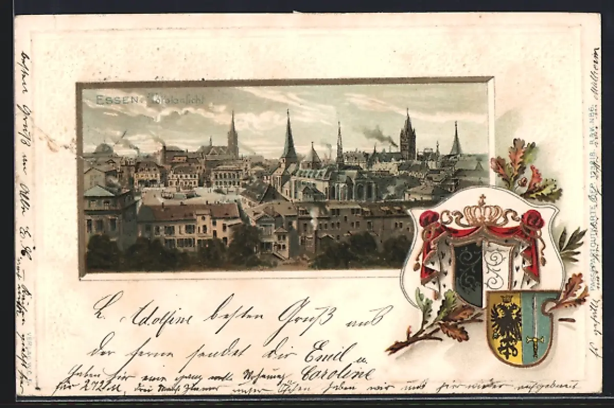 Passepartout-Lithographie Essen / Ruhr, Stadtansicht, Wappen