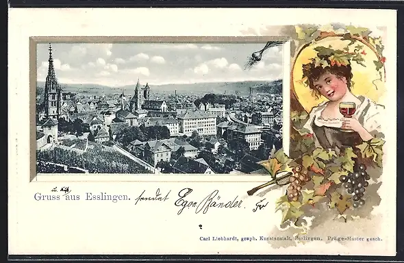 Passepartout-Lithographie Esslingen / Neckar, Blick auf den Ort, Frau mit Weinglass, -blättern und -trauben