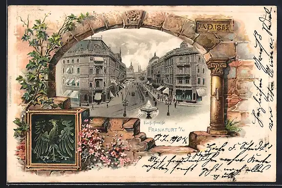 Passepartout-Lithographie Frankfurt, Kaiserstrasse mit Brunnen, Geschäften, Mauerpasspartout mit Rundbogen, Wappen