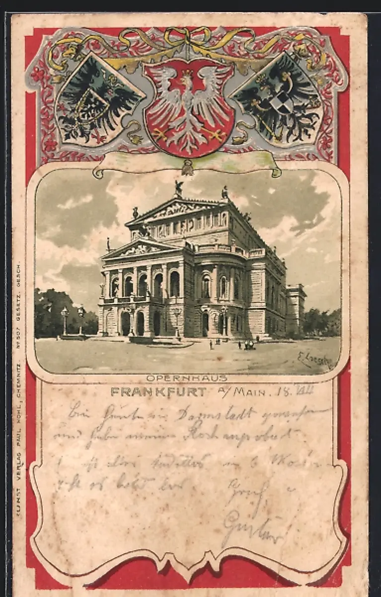 Passepartout-Lithographie Frankfurt a. Main, Opernhaus, Wappen
