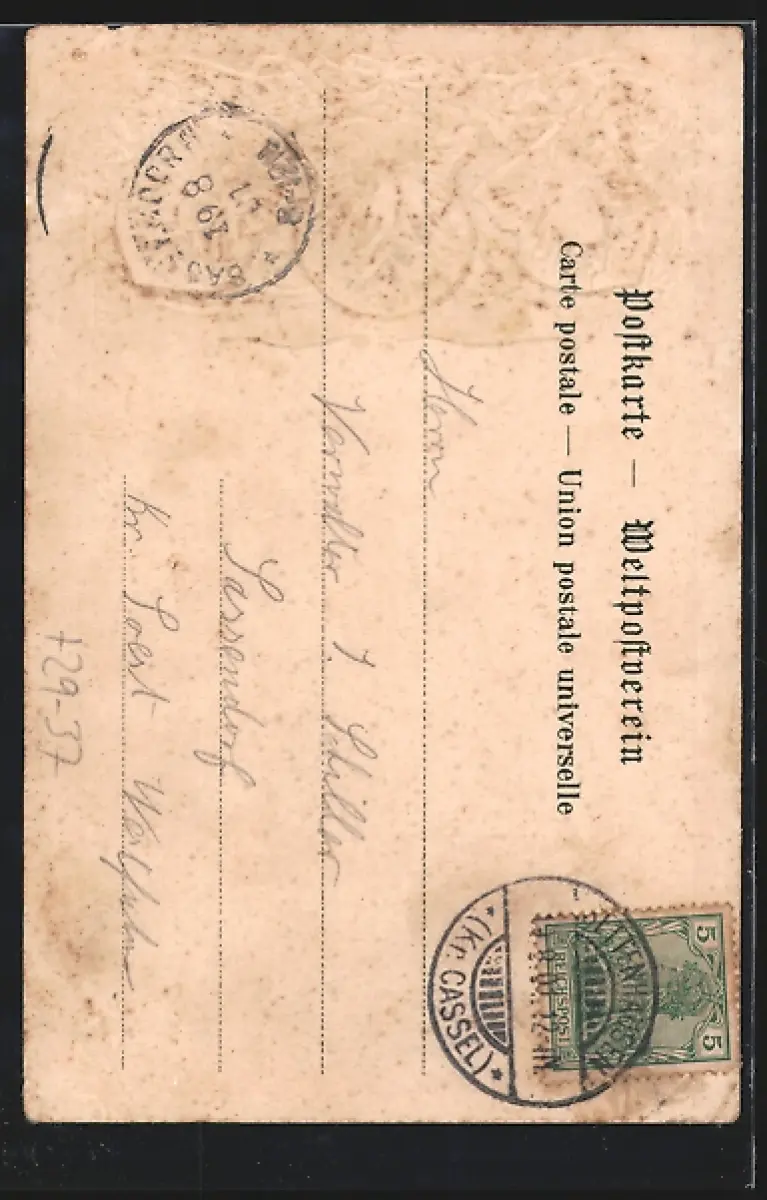 Personenbezogene Daten auf der Rückseite der Karte wurden durch blauen Textmarker unkenntlich gemacht. Die blauen Stellen sind auf die Vorderseite durchgeweicht und wirken sich negativ auf das Postkartenfoto aus