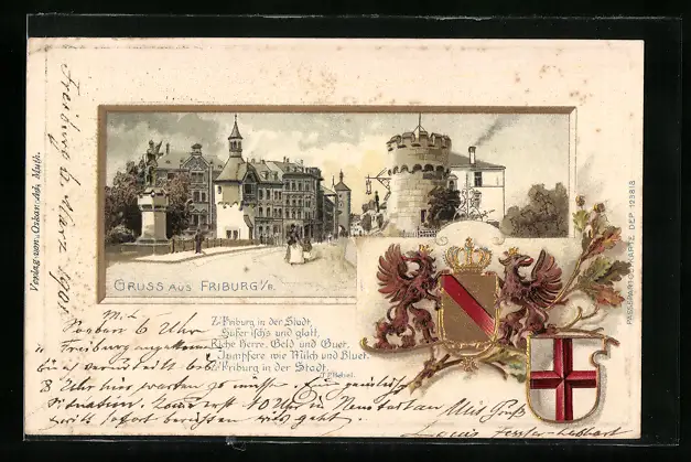 Passepartout-Lithographie Freiburg / Breisgau, Strassenansicht mit Denkmal, Ortswappen