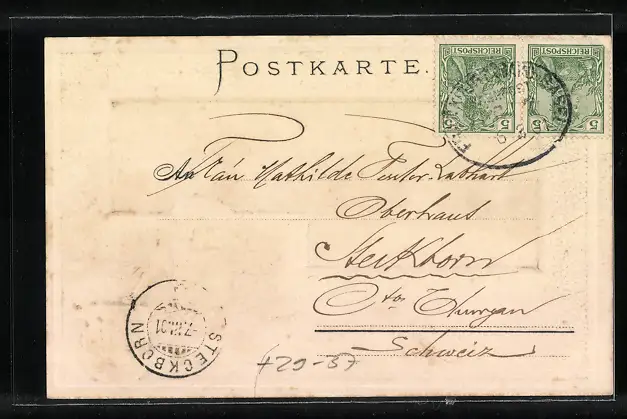 Personenbezogene Daten auf der Rückseite der Karte wurden durch blauen Textmarker unkenntlich gemacht. Die blauen Stellen sind auf die Vorderseite durchgeweicht und wirken sich negativ auf das Postkartenfoto aus