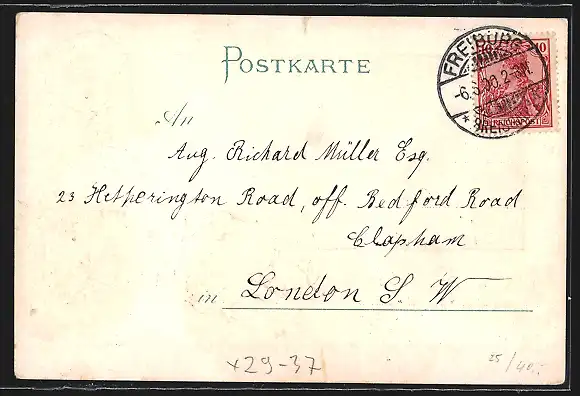 Personenbezogene Daten auf der Rückseite der Karte wurden durch blauen Textmarker unkenntlich gemacht. Die blauen Stellen sind auf die Vorderseite durchgeweicht und wirken sich negativ auf das Postkartenfoto aus