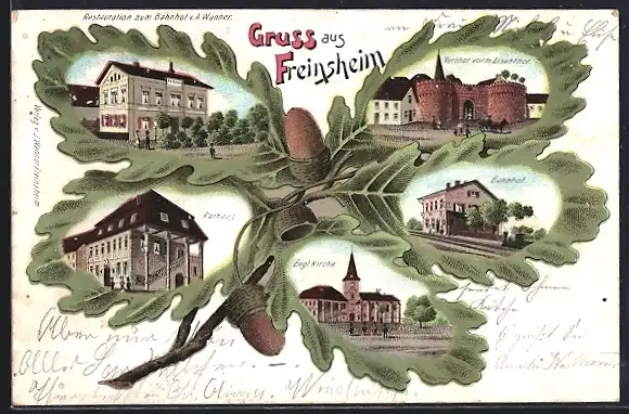 Passepartout-Lithographie Freinsheim, Rathaus, Bahnhof, Kirche