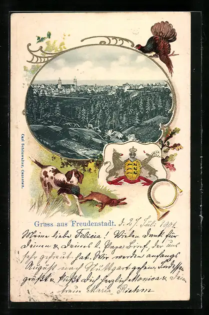 Passepartout-Lithographie Freudenstadt, Totalansicht, Jagdhund mit Beute