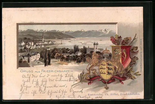 Passepartout-Lithographie Friedrichshafen, Teilansicht mit Kirche, Wappen