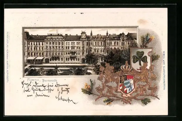 Passepartout-Lithographie Fürth, Strassenpartie in der Promenade, Wappen