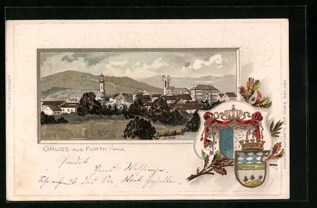 Passepartout-Lithographie Furth i /Wald, Teilansicht mit Kirche, Wappen