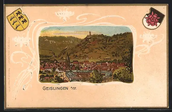Passepartout-Lithographie Geislingen a. St., Panoramablick auf den Ort, Wappen