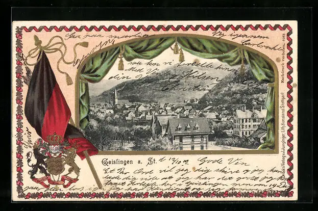 Passepartout-Lithographie Geislingen a. St., Teilansicht im Vorhang-Rahmen, Wappen und Fahne