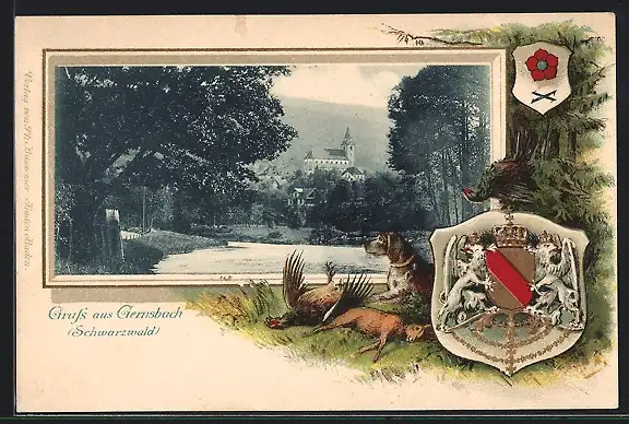 Passepartout-Lithographie Gernsbach, Flusspartie gegen Kirche, Wappen