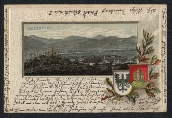 Passepartout-Lithographie Godesberg, Ortsansicht aus der Vogelschau, Wappen