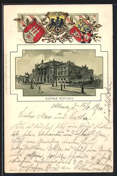 Passepartout-Lithographie Hamburg-Altona, Partie am Rathaus, Wappen und Lorbeerzweig