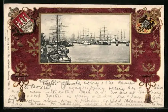 Passepartout-Lithographie Hamburg, Blick in den Segelschiffhafen, Wappen