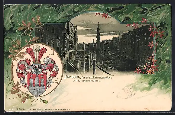 Passepartout-Lithographie Hamburg, Fleet b. d. Reimersbrücke mit Katharinenkirche, Wappen
