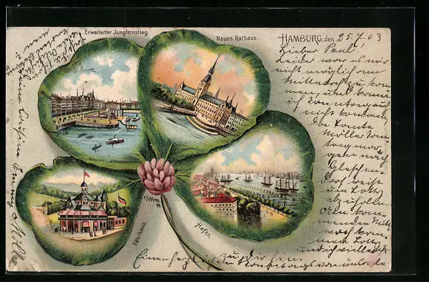 Passepartout-Lithographie Hamburg, Gasthaus Fährhaus, Alter u. neuer Jungfernstieg, Neues Rathaus im Kleeblatt
